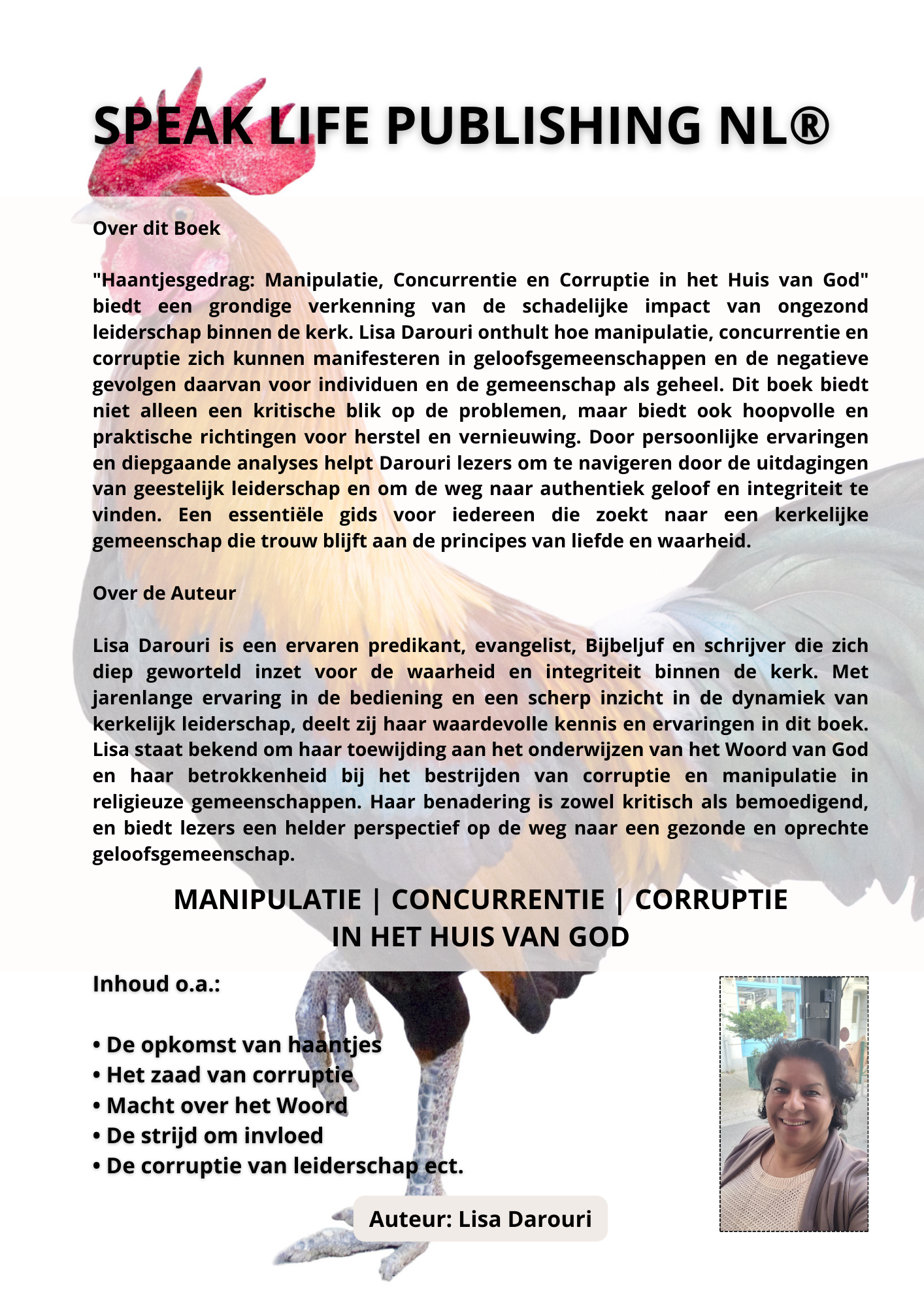 Haantjesgedrag: Manipulatie, Concurrentie en Corruptie in het Huis van God onderzoekt hoe ongezond leiderschap de kerk kan schaden. Lisa Darouri legt bloot hoe manipulatie en corruptie gemeenschappen ondermijnen en biedt hoopvolle stappen naar herstel. Met Bijbelse inzichten, persoonlijke ervaringen en praktische adviezen inspireert zij lezers tot authentiek geloof en kerkelijke integriteit.